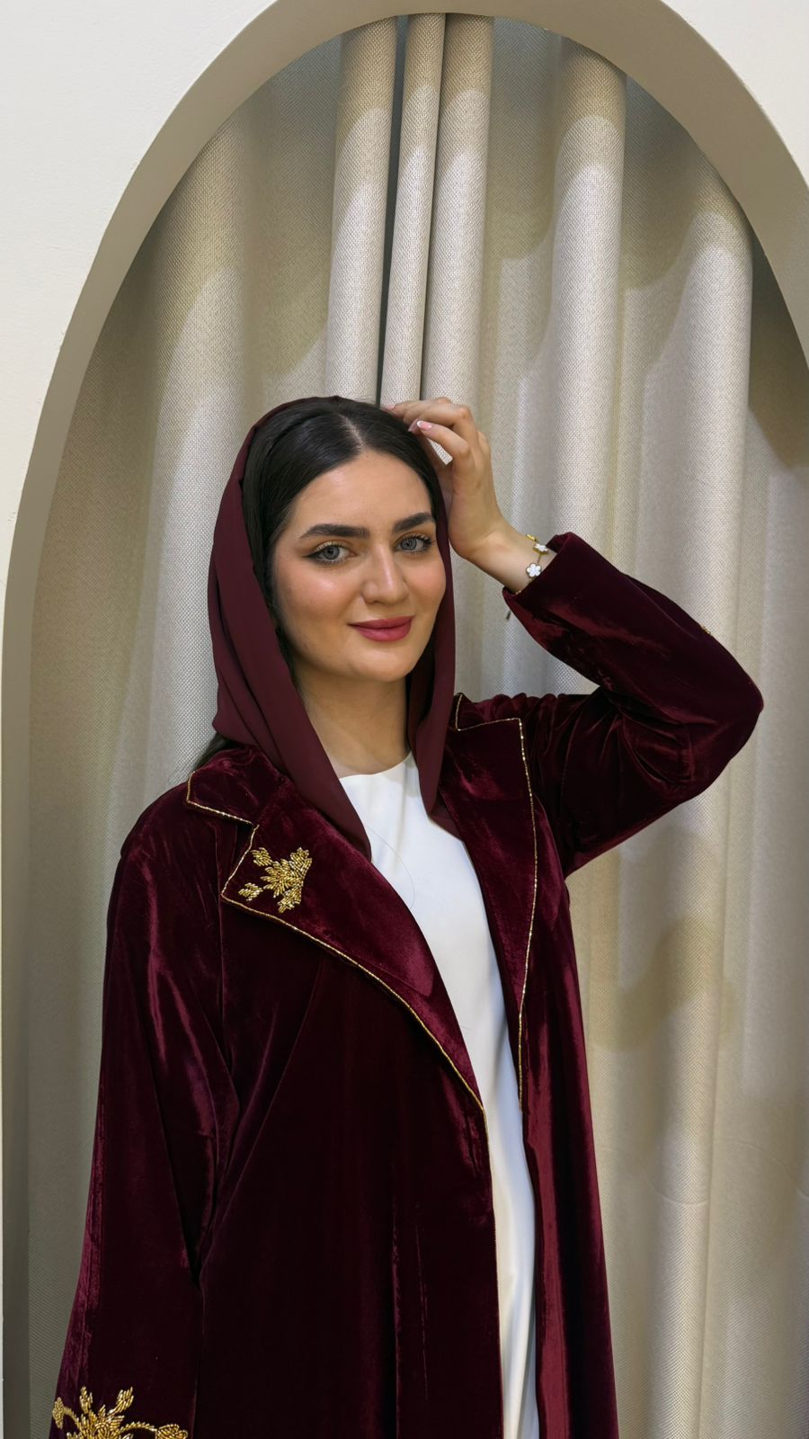 عباية مخمل مبطنة بتصميم فاخر، مزينة بشغل شَك يدوي ياباني. تأتي مع شيلة متناسقة تكمل الإطلالة لتجمع بين الفخامة والتميز في كل مناسبة.